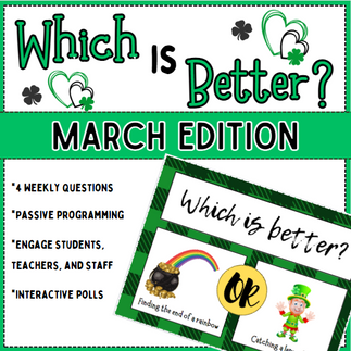 Last but not least, our March "Which is Better" pack is printed with our weekly interactive polls. We won't begin these until March but they are an easy way to interact with students and are always a great conversation starter.