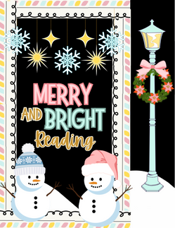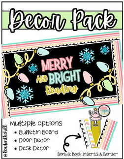 We used soft colors with bright lights in all our decor this year. Their days are stressful enough. When our students walk into the library, we want them to instantly relax and feel at home. The colors in this decor are calming and the lights keep things fun and playful. Our Merry and Bright decor is consistent throughout the library - students will see it on our doors, circulation desk, bulletin board, and displays. We also have bookmarks, due date slips and book inserts all with the same theme. All of these and more can be found HERE